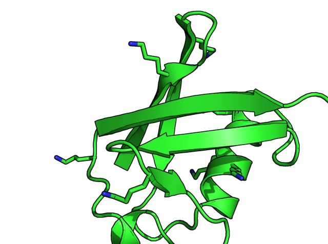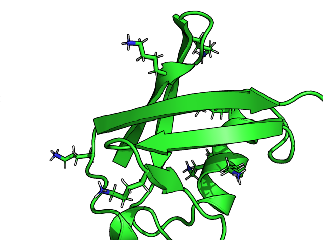 I am using 1UBQ (ubiquitin structure determined by X-ray crystallography) as the example in this post. The left panel below selectively displays lysine sidechains with sticks. Then I typed