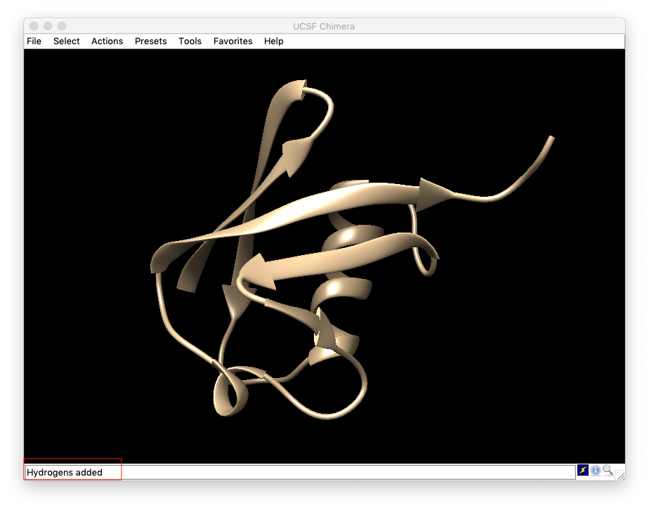 - Once hydrogens are added, the window closes. Users can check the bottom left corner in UCSF Chimera window to confirm hydrogens added (see the red boxed area in the second-to-last figure).