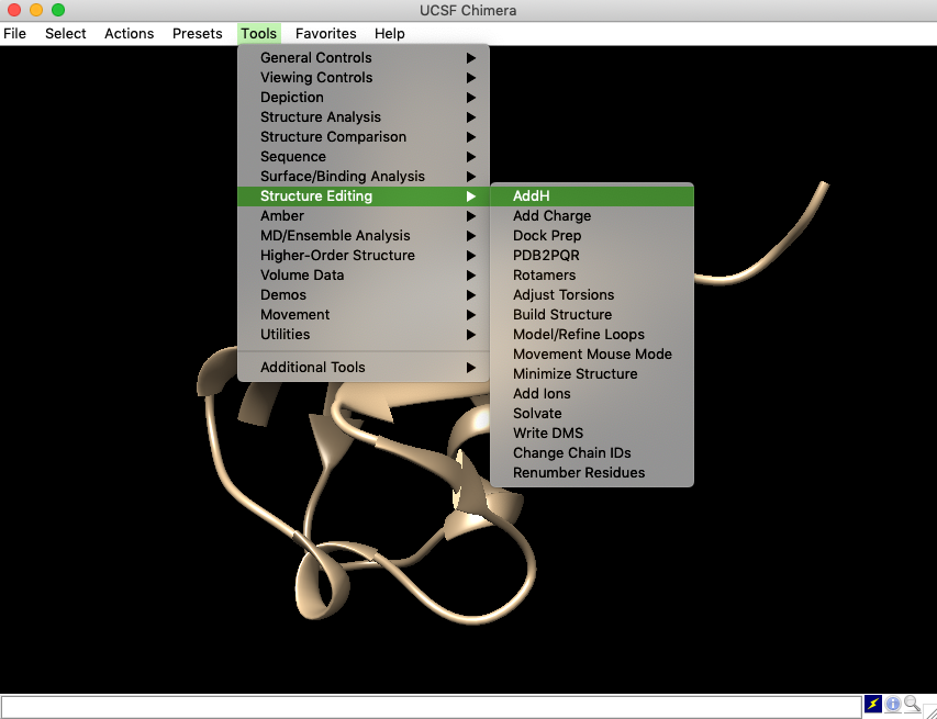 - First, load target protein structure (here is 1UBQ), then go to the tool bar, find “Tools”, select “Structure Editing” and the popped sub-panel has “AddH”. Chose it.