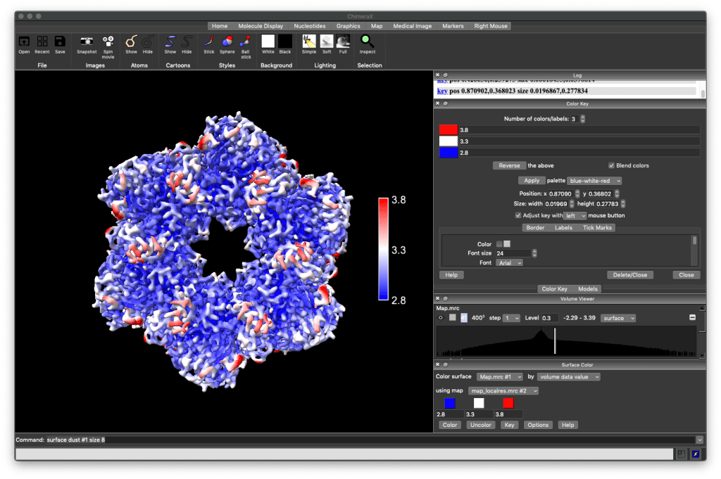 The map now is colored as desired. Simply click the color box to change whatever color we want to use. After that, click “Key” button to pop up another panel and a use “left mouse button” to adjust location/size of the color key in ChimeraX display panel. Then we can save image for further use.