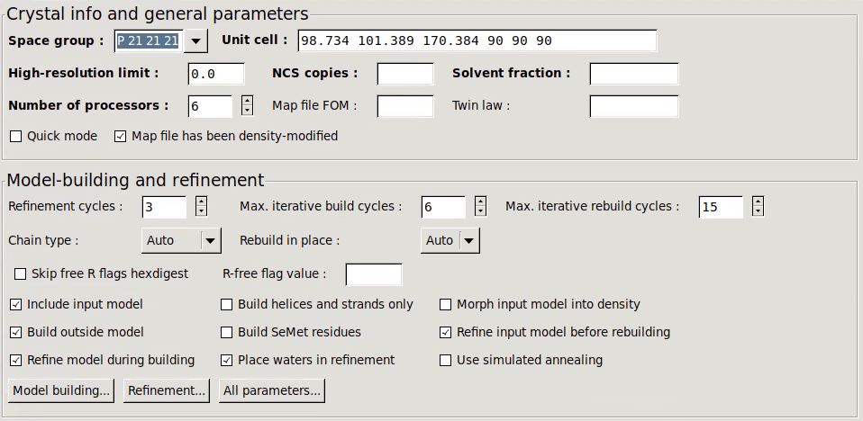 Below are snapshots of parameters used for Phaser (simple mode), autobuild and Refinement