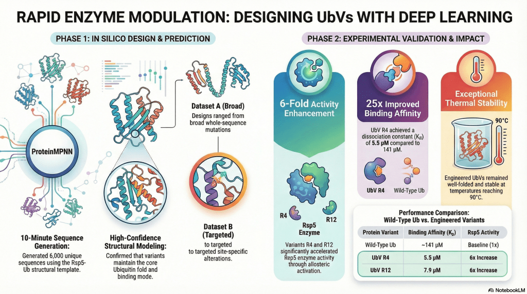 We are very happy to receive a notice email from ACS Synthetic Biology that our manuscript was accepted and online published ahed. The work entitled “Robust design of effective allosteric activators for Rsp5 E3 ligase using the machine-learning tool ProteinMPNN” to show a simple but robust approach to converting ubiquitin into an effective allosteric activator. We used a program called ProteinMPNN right after it was released to the public (GitHub, paper). The goal is to design a new ubiquitin variant (UbV) functioning as a specific activator for the Rsp5 E3 ligase.