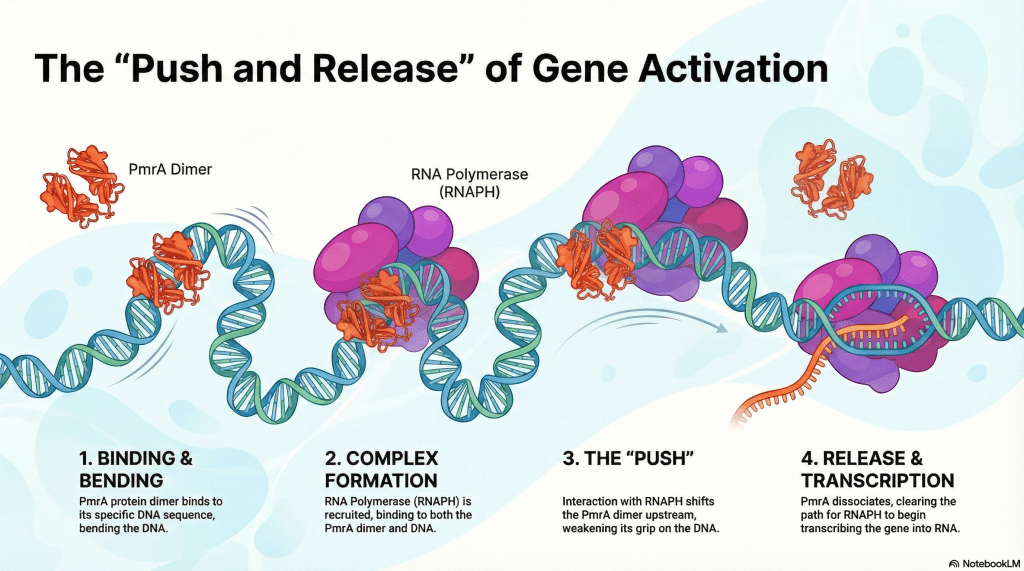 Our work reveals a striking DNA shift, indicating that the PmrA binding sequence differs from the previously defined CCTAAT. The cryo-EM data redefines PmrA-DNA interactions when the transcription activation complex is regulated by PmrA, likely representing an escape mode. Since PmrA is linked to polymyxin resistance, we hope that this structural finding opens up opportunities to develop drugs against Klebsiella pneumoniae.