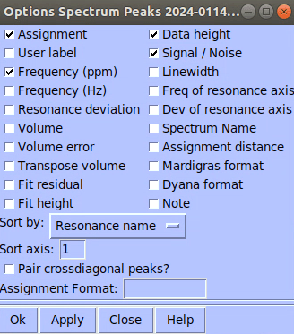 The “list” in Sparky format of the two spectra must contain information of “Data height” and “Signal / Noise” (see below snapshot). If more columns are provided, user has to adjust the script appropriately.