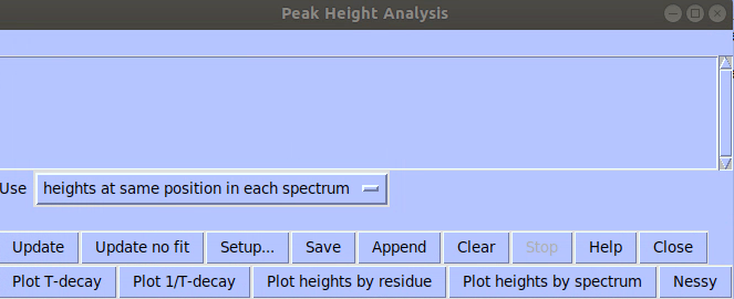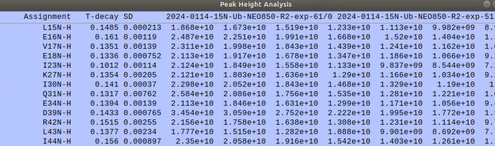 To analyze the relaxation rates (R1, R2), I suggested the “rh” function in Sparky. Just simply load the experiment and provide the relaxation time, then select peaks and type “rh”. Sparky will automatically fit and generate a table for you.