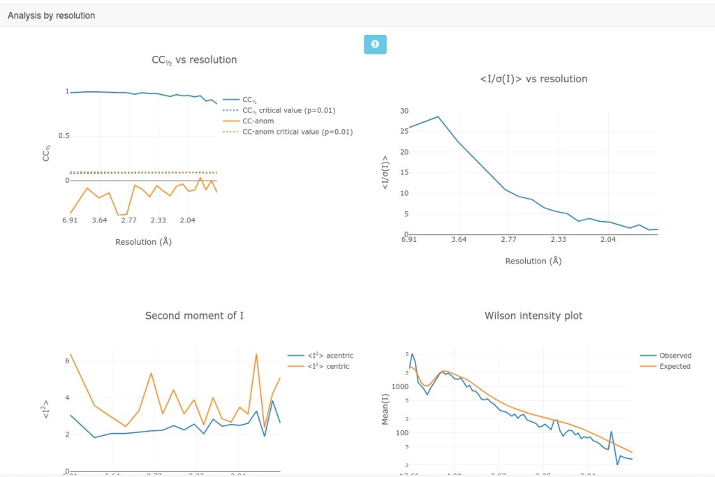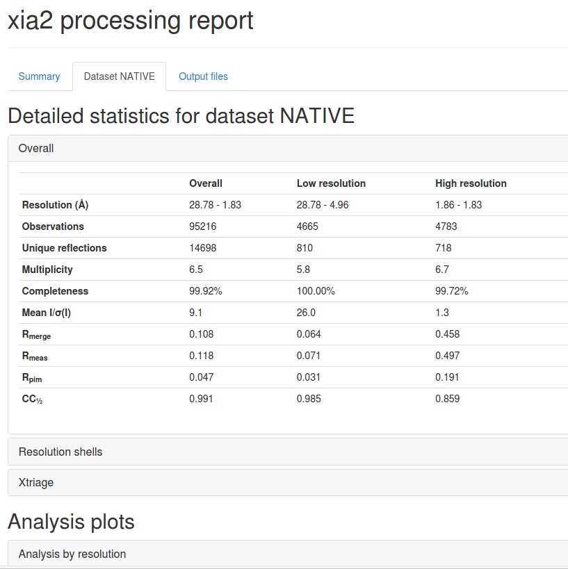 In addition to the text output, the xia2.html provide more analysis for users to know the quality of data. This integrated page is more convenient than sparse information provided in HKL2000 or XDS. Some snapshots are shown below.