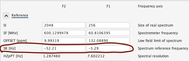 Where SR is the shift values of desired nuclei, 𝚵c and 𝚵N are the ratios of 13C/1H and 15N/1H, respectively, and 1H-BF, 13C-BF, 15N-BF are the 1H, 13C, and 15N carrier frequencies of spectrometer, respectively.