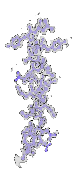 CryoSparc was used to reconstruct the 3D map of apoferritin and structure model was built. The structural quality is great as no outliers were found and the molprobity clashscore is low (see the PDB validation bar graph above). Below images show the map colored without and with structural chains. I also extracted the map covered residues 12-35 of chain A (using ChimeraX). The holes in the benzene rings of three TYR residues are vivid. Sidechains maps and atoms are well matched presenting a cryoEM structure of apoferritin.