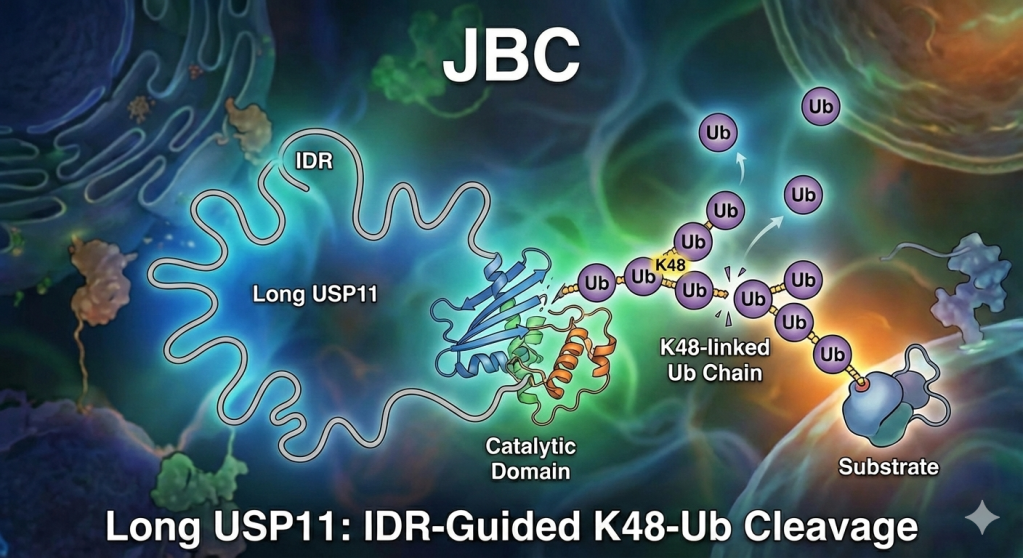 In our recent paper in Journal of Biological Chemistry, we set out to understand how USP11, an enzyme that removes ubiquitin tags from proteins, knows which targets to act on. USP11 is special because its catalytic domain is split in two, with a UBL2 domain and a flexible region (IDR) inserted in between.